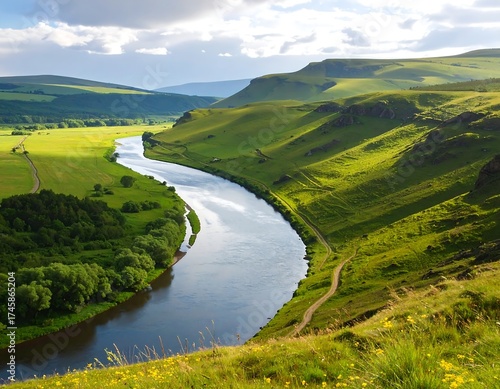 Serene river meandering through verdant valley