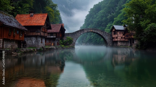 Serene river scene with a stone bridge, quaint houses, and misty forest backdrop
