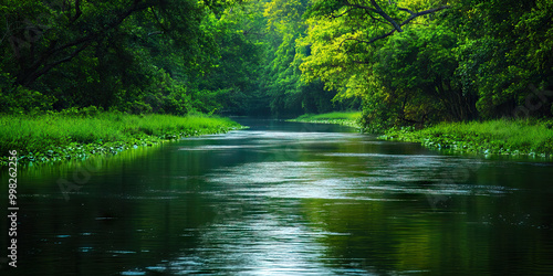 Serene Riverine Landscape: A gently flowing river meandering between verdant riverbanks, teeming with wildlife