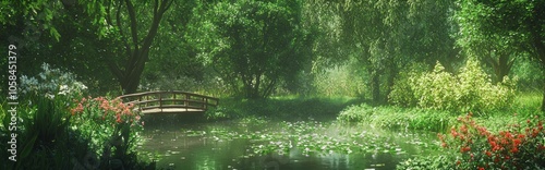 Serene Riverside Retreat - Lush Greenery, Wooden Bridge, Colorful Flowers, Ultra-Detailed Panoramic Landscape Photography