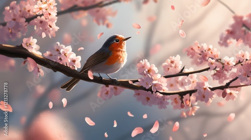 Serene Robin in Cherry Blossom Paradise: A Digital Painting of Tranquility