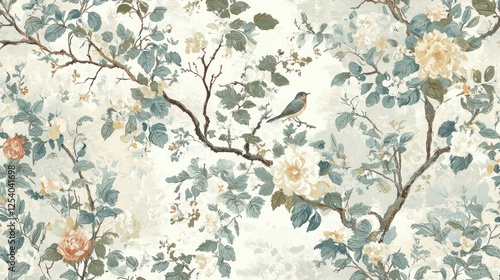 Serene Roman wallpaper featuring a forest garden with intricate floral patterns and birds