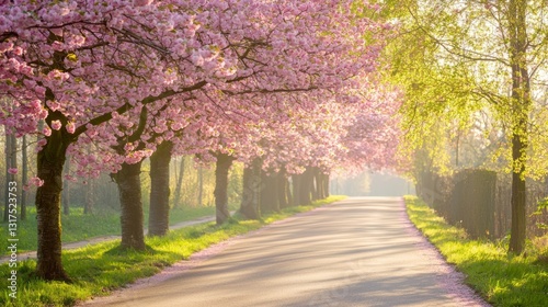 Serene Row of Cherry Blossom Trees Framing a Peaceful Pathway