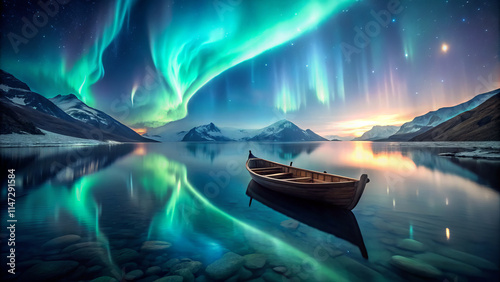 serene rowboat floats on tranquil lake, reflecting vibrant auroras above. stunning colors of northern lights illuminate night sky, creating magical atmosphere