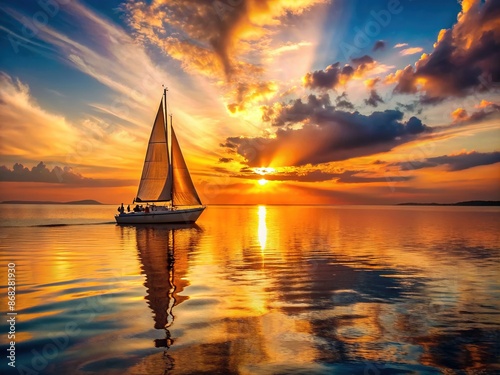 Serene sailboat glides effortlessly across tranquil ocean waters, bathed in warm golden light of a stunning sunset, with majestic sail unfurled and reflection rippling below.