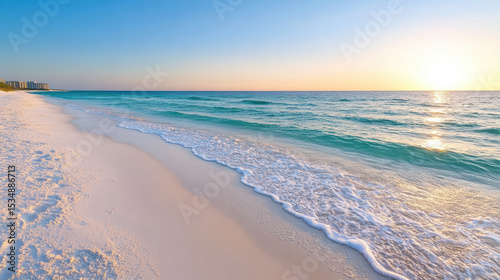 Serene sandy beach with gentle waves at sunset, creating peaceful atmosphere
