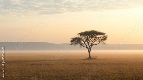 Serene savanna sunrise with a lone acacia tree in the golden light