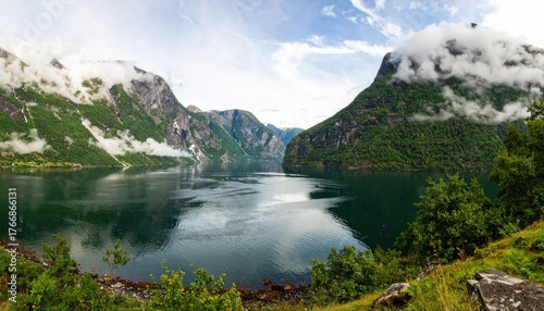 Serene Scandinavian Fjord Panorama with Misty Mountains and Calm Water Reflection