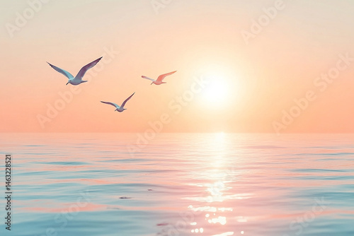 Serene seascape with seagulls soaring at sunset, embodying freedom and peace
