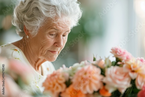 Serene Senior Woman Enjoying Floral Arranging as Relaxing Retirement Hobby