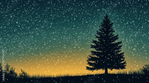 Serene silhouette of a Christmas tree against a snowy evening sky with falling snowflakes