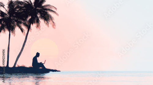 Serene silhouette of a person sitting on a small rocky outcrop by the water at sunset with palm trees in the background creating a peaceful tropical scene