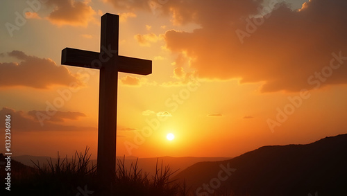 Serene Silhouette of Catholic Cross at Sunrise: A Symbol of Faith and New Beginnings in Nature