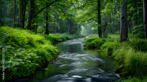 Serene Snapshot of a Picturesque Narrow River Meandering through an Unspoiled Green Forest