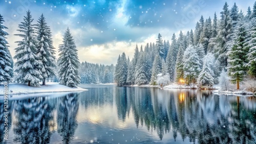 Serene snowfall on a peaceful winter landscape with tall evergreen trees and a frozen lake in the background , snowy forest, nature's beauty