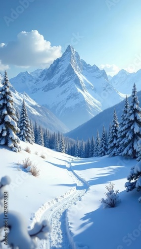Serene snowy landscape with snow-capped mountains in the background, snowflakes, wintery