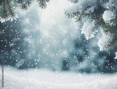 Serene Snowy Winter Background with Falling Snowflakes and Pine Branches
