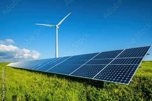 serene solar farm and towering wind turbine stand in lush green fields against a pristine blue sky, for clean energy, sustainable future, eco-friendly and renewable energy concept, ai