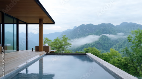 serene spa retreat featuring tranquil pool overlooking lush mountains and misty valleys