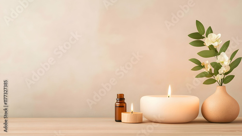 Serene spa setting candles, essential oil, flowers. Calm background for wellness, relaxation, or beauty product promotion.