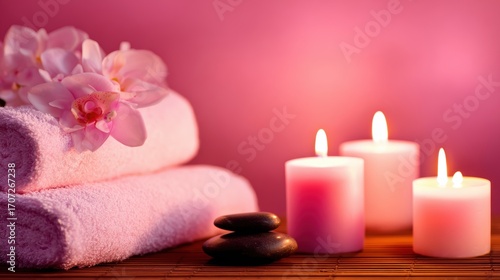 Serene spa setting with pink towels, candles, and stones, creating a calming atmosphere for relaxation