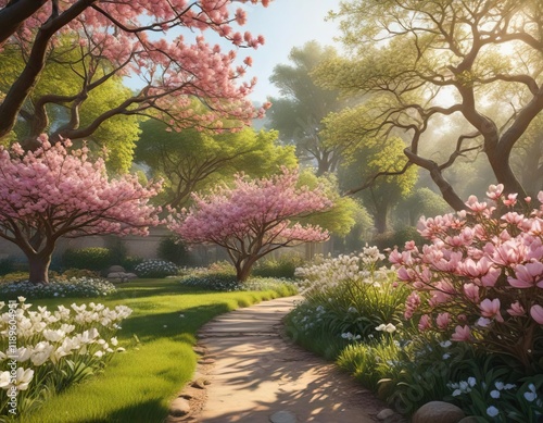Serene spring morning in a garden with blooming magnolia, peaceful atmosphere, blooming flowers, soft focus