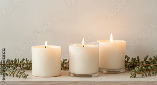 Serene Still Life with Cylindrical Candles and Botanical Accent, Light Hues.