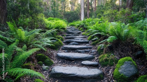 Serene Stone Path Through Lush Green Ferns in a Tranquil Forest Setting Surrounded by Nature's Beauty