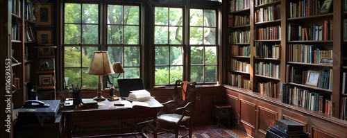 Serene Study With Bookshelves And Window View