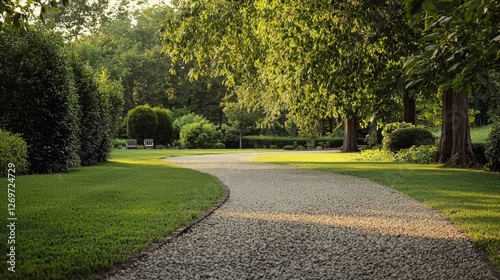 Serene Suburban Scene with Neatly Defined Gravel Pathway and Trees