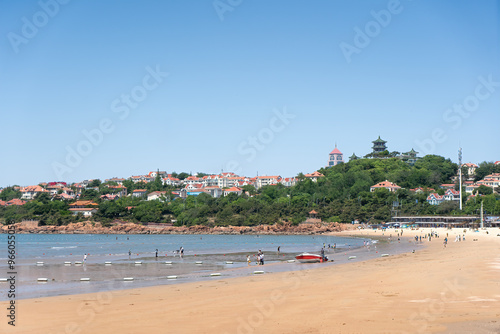 Serene Summer Day at a Scenic Beach with Coastal Town Views