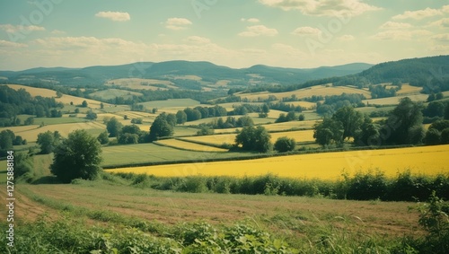 Serene Summer Rural Landscape with Vibrant Fields and Rolling Hills Ideal for Nature Themes and Text Presentation