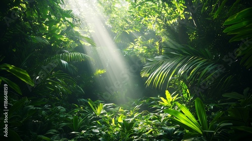 Serene Sunlight Streaming Through Lush Tropical Jungle Canopy