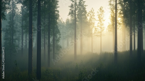 Serene sunlit forest scene outdoor nature misty landscape eye-level viewpoint for tranquil experiences
