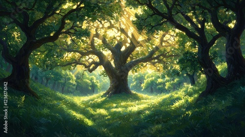 Serene Sunlit Forest Scene with Lush Greenery and Majestic Trees