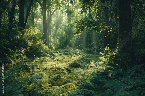 Serene sunlit forest with lush green undergrowth, peaceful woodland landscape