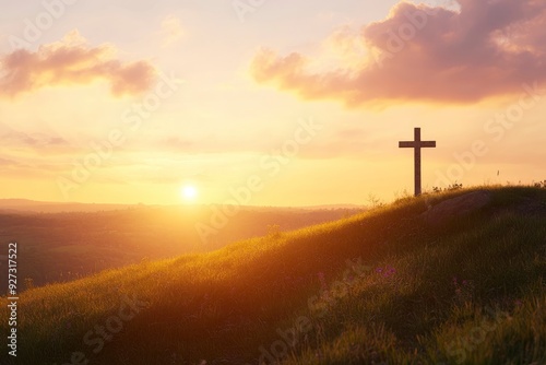 Serene Sunrise Behind Cross on Hill, Spiritual Awakening Concept , ai