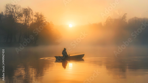 Serene Sunrise Over a Misty Lake with a Lone Fisherman, Capturing the Tranquil Beauty of Early Morning Reflections and a Peaceful Natural Scene Perfect for Calm Escapes