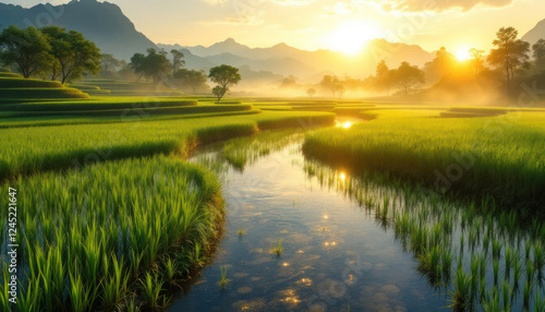 Serene Sunrise Over Lush Green Rice Paddies And Mountain Range