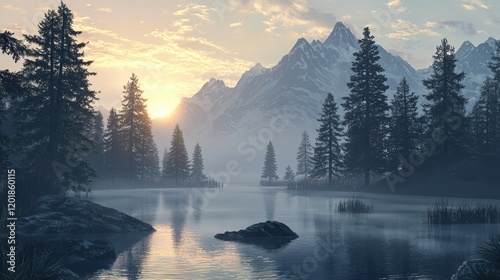 Serene Sunrise over Misty Mountain Lake with Evergreen Trees