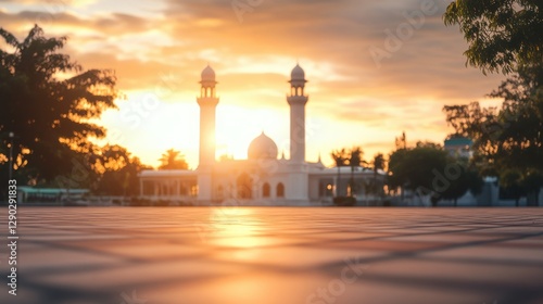 Serene Sunrise Over Mosque with Majestic Minarets and Calm Surroundings