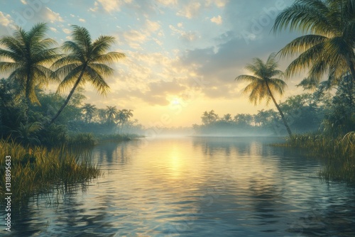 Serene sunrise over tranquil waters with palm trees reflecting in the calm lagoon
