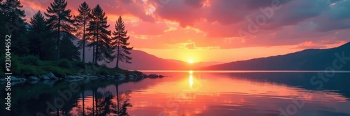 Serene sunset behind towering pine trees over a tranquil lake with water's glassy reflection, serene, lake, sunset