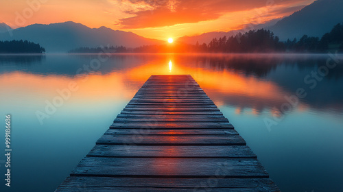 serene sunset casts warm hues over a wooden pier extending into a tranquil lake, symbolizing peace and reflection. The interplay of light and water evokes feelings of serenity and connection with natu