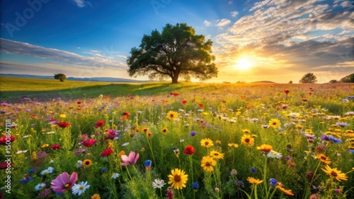 Serene Sunset Illuminates Vibrant Wildflower Meadow with Majestic Solitary Tree