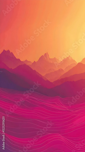 Serene Sunset Landscape: Abstract Mountain Waves in Vibrant Purple, Pink, and Orange Gradients for Tranquil Digital Art Harmony and Aesthetic Exploration of Nature's Beauty