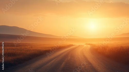 serene sunset landscape featuring winding dirt road surrounded by golden fields and distant hills. warm hues of sky create peaceful atmosphere