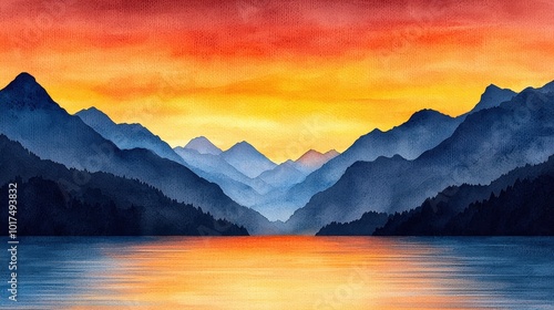 Serene Sunset Mountain Lake Watercolor Landscape Art Print