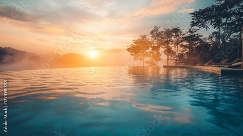 Serene Sunset Over Infinity Pool with Reflective Water and Misty Hills
