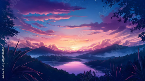 Serene sunset over misty lake and mountains, viewed from lush foliage; ideal for travel or relaxation themes